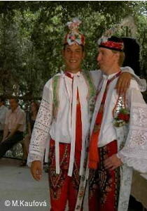 převlečené do chlapeckých krojů - košele a třaslavic, přijdou zpívajícím průvodem za zvuku muziky kolem 19. hod pod zelené. Tady je uvítají stárci, zavdají děvčatom vína, předají jim vládu a odcházejí. Dívky zazpívají písničku, kterou sami odpoledne složily, a ve které se vypráví o průběhu letošních hodů. Nezapomenou v ní pochválit ty, kteří pomohli, očernit všechny, kdo se na pomoc vykašlali, zkritizují seménko, jímž se sypal taneční plac a které příliž klouzalo, na muziku taky nezapomenou. ![]() Po písničce následuje společný verbuňk, po verbuňku sólo s maminkami. A než bys řekl švec, už začínají jezdit přespolňačky, na kolech, na koních, v autech... přijdou, zazpívají, odverbují, vysypou piliny či jiný nepořádek ( to, aby místním děvčatům neztuhly žíly na nohách, či jako oplátka za loňský rok,...). Místní krojované se chytnou svých košťat a zametají a zametají, až se práší. Občas se ztrhne i nějaká drobná potyčka mezi různými dědinami. Tak to jde pořád dokola do doby, než začnou jezdit kluci za maškary. Co jsou maškary? To se kluci převléknou za holky, dají dívčí plavky, podprsenky apod. vymoženosti moderní doby, pustí přiměřený zvukový doprovod např. "Když se podaří, co se dařit má - spartakiádní", nebo z pohádky Mrazík, a všichni dohromady vytvoří nezapomenutelnou scénku jako jsou např. akvabely ve vaně, kára - vana s velbloudem, babský aerobik ....